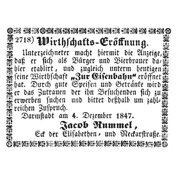 Der Grundstein für die Erfolgsgeschichte der Darmstädter Privatbrauerei ist gelegt – Jakob und Johann Adam Rummel gründen die Brauerei und Gaststätte „Zur Eisenbahn“ an der Neckar- und Elisabethenstraße.