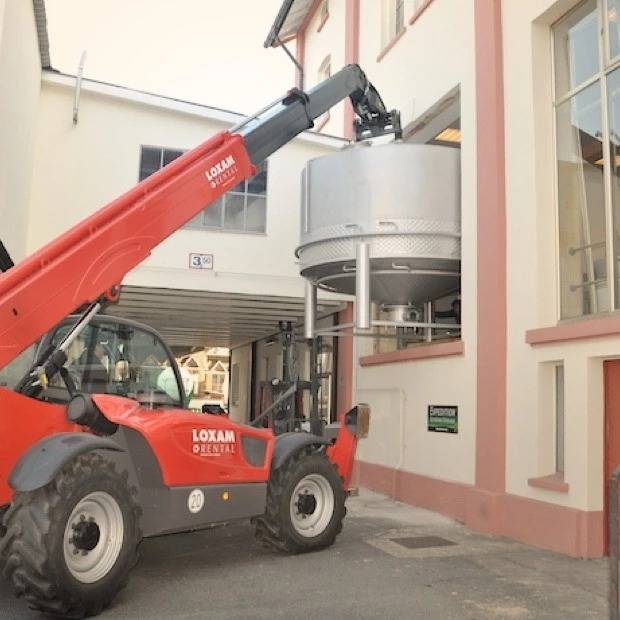 Das Sudhaus bekommt in maßgenauer Arbeit eine neue Sudpfanne. Für den Einbau in das Sudhaus musste die Sudpfanne mit einem Kran durch die Fensterfront millimetergenau hereingehoben werden.